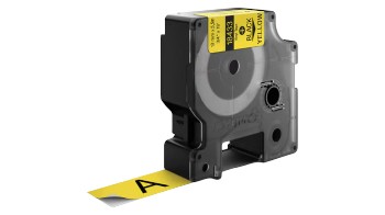 Industrial label tape, DYMO Rhino, label width: 19 mm, tape length: 5.5 m, material: vinyl, print colour: black, tape colour: yellow, adhesive: permanent, format: cassette, compatible with: DYMO Rhino label printers, properties: chemical-resistant, UV-resistant, water-resistant, RoHS compliant.
