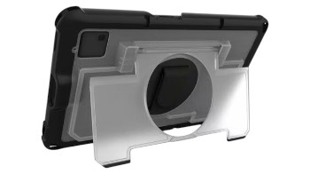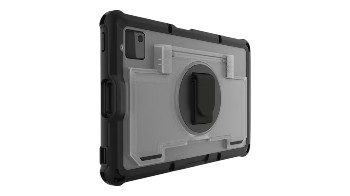 The case features an integrated 360-degree rotating hand strap for secure one-handed use and quick switching between portrait and landscape orientations. A built-in friction-hinged easel stand allows stable positioning for hands-free operation, making it ideal for scanning, data entry, and workstation use. Constructed from polycarbonate, TPU, nylon, and elastic materials, and tested to MIL-STD-810H drop standards, it delivers both durability and ergonomic efficiency in demanding workflows.