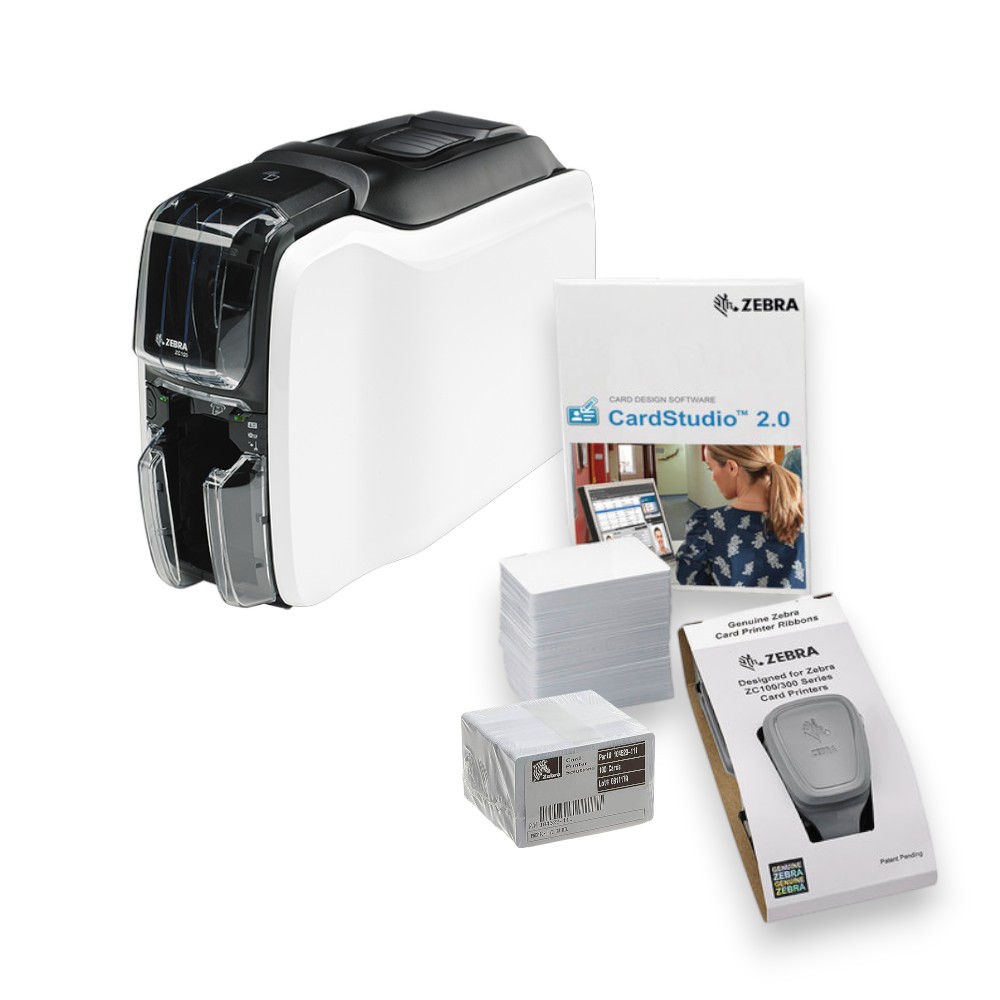 The bundle includes everything needed to get started—Zebra CardStudio software for design and printing, a full-colour ribbon, 200 blank PVC cards, and all required cables and power supplies. With a 100-card input capacity and easy USB connectivity, the ZC100 ensures seamless operation right out of the box, making it a perfect entry-level solution for on-demand card personalization.