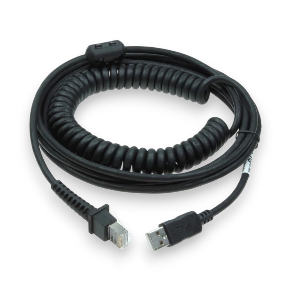 2.4 m coiled USB data transfer cable for Datalogic barcode scanners, plug-and-play connectivity, black (CAB-553).