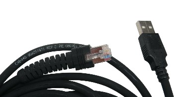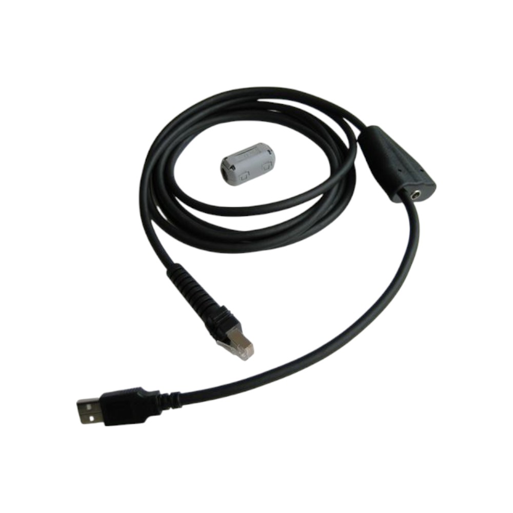 USB cable, straight Type A to scanner interface, external power support, length: ~2 m (8 ft), color: black, copper conductor, compatible with Datalogic PowerScan 8300/8500/8000 series scanners.