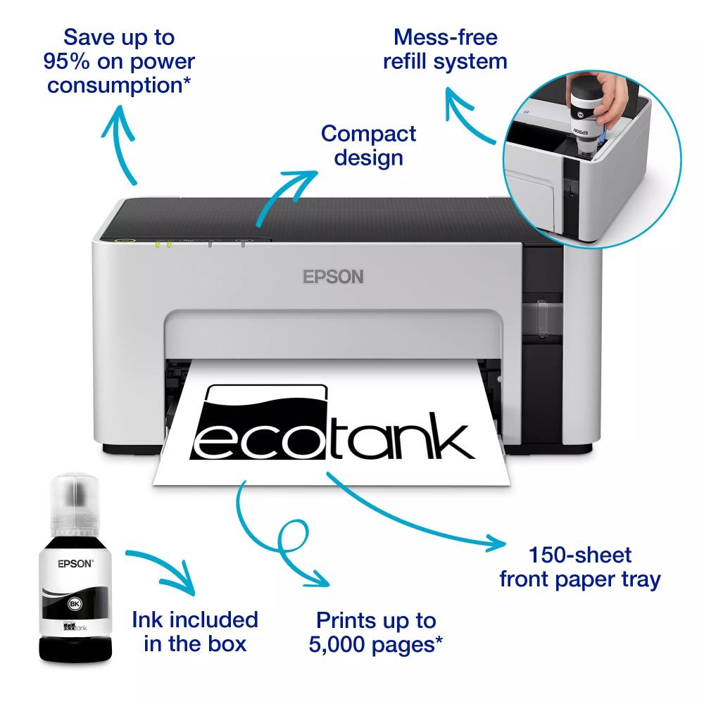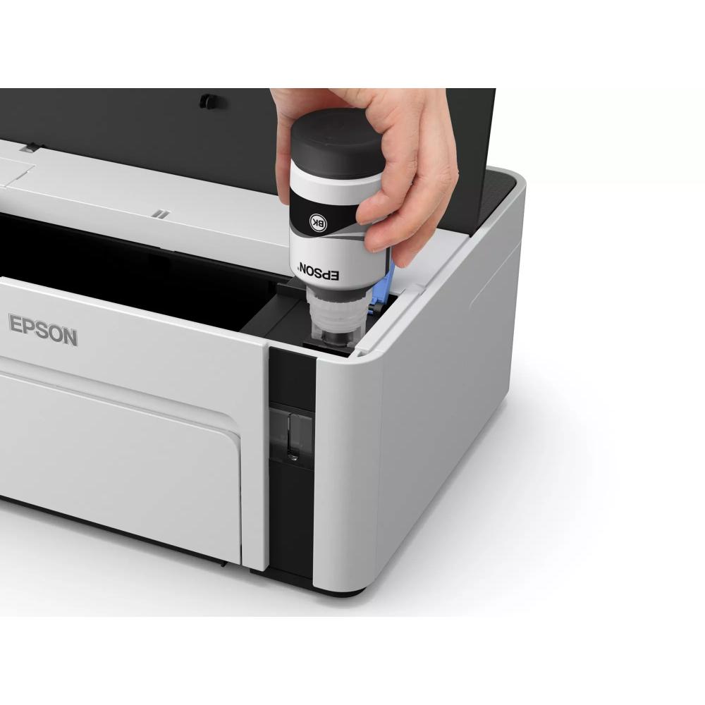 The Epson EcoTank M1120 A4 Mono Wi-Fi Ink Tank Printer is a cost-efficient monochrome printer designed for home offices and small businesses that require reliable high-volume black-and-white printing. Featuring Epson’s EcoTank refillable ink system with large ink bottles, it significantly reduces running costs and allows printing of thousands of pages before needing a refill. The pigment black ink produces sharp, water- and smudge-resistant text suitable for documents, reports, invoices and more.
